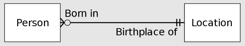 For every Location, one and only one (two dashes) Location may have zero (circle) or many (two 45 degree angled lines) Persons born in it.
